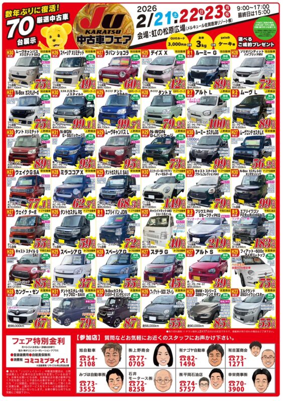 2026年2月21日(土)~23日(月祝)虹の松原広場にて唐津地区・中古車フェアを開催します!