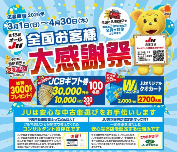 2026年3月1日から4月30日までの2ヶ月間、第13回オールJU全国お客様大感謝祭を開催します!